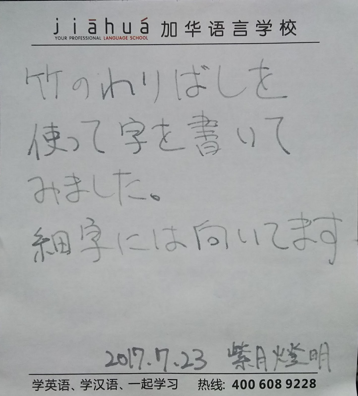 こちらが木の割りばしで書いてみた字。気が柔らかく、試し書きしているうちに先がつぶれてしまいました。字がちょっと太めです。